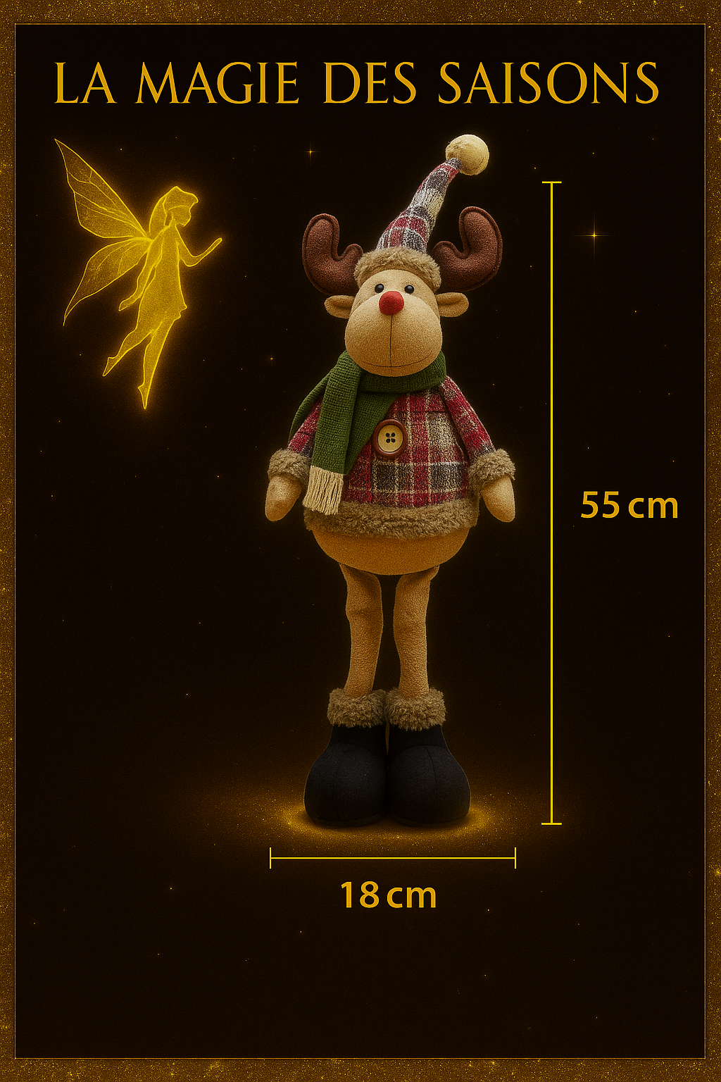- Renne : Adorable renne avec ses bois majestueux, veste verte et pantalon à carreaux